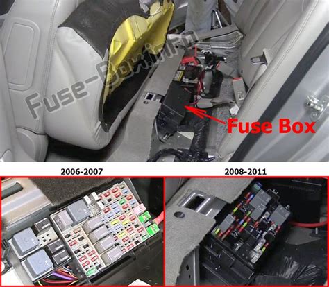 Fuse box location it is located under the rear seat (remove the seat and open the fusebox cover). The underhood fuse block is located on the passenger side of the engine compartment. The rear seat cushion must be removed to access the rear fuse block. See more on our website: The rear fuse block is located under the rear seat.
